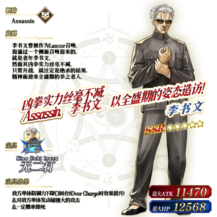 李書文が最も得意とした技。 今一つ実像が掴めないのは八極拳各流派によって技の形が異なるせいか。 真名:李書文 編集 ソースを編集 神槍 李書文の別側面として召喚された老年期の李書文。 その凶拳に曇りは無く、戦えば絶殺という結果に違いもない。 李書文 (アサシン) レアリティ:ストーリー限定星5 (恒常ではあるがストーリーガチャでのみ排出) クラス:アサシン 属性:男性 中立・悪 人属性 (人型) カード: q a 099 宝具:无二打 (にのうちいらず) a FateRPG『Fate/Grand Order』(以下『FGO』)では、1月8日(火)18時から1月22日(火)1259までの15